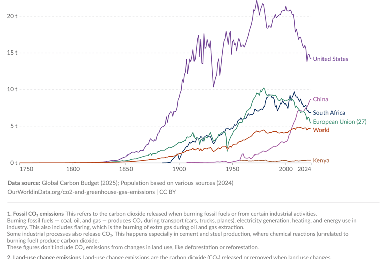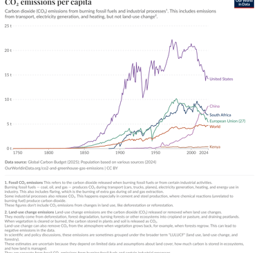 If we divide the total carbon emissions from the US per year by the number of people living in the US we get a per capita emissions of 14,000 kg. (World in Data) This is alot! It is three times the global average and 40 times more than the per capita emissions of people in Kenya.